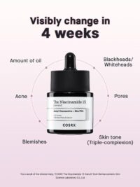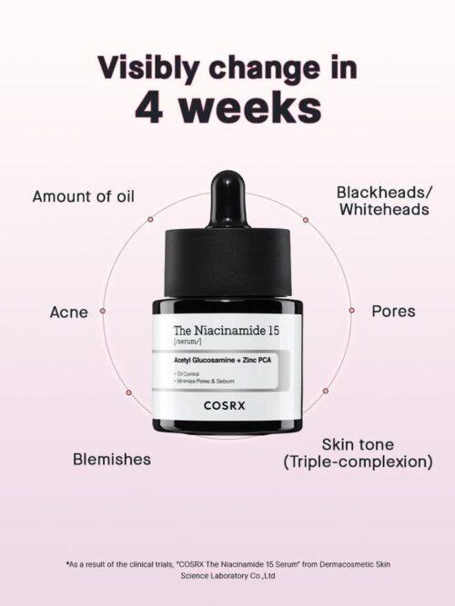 عنصر اصلی سرم نیاسینامید ۱۵ کوزارکس این فرمول نیاسینامید است که توانایی قابل توجهی در تنظیم تولید سبوم و چربی، درمان لک و اسکار آکنه و بهبود بافت کلی پوست دارد. این سرم با ۱۵ درصد نیاسینامید، دوز قوی از این ماده را برای رفع جوش، جای جوش و اندازه منافذ باز ارائه میدهد و به شما اعتماد به نفسی میدهد تا پوست خود را به نمایش بگذارید.