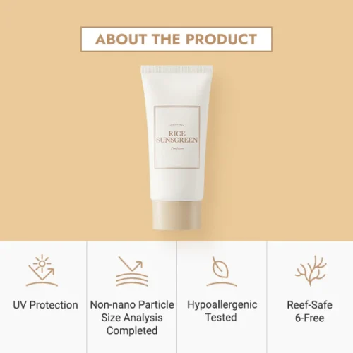 کرم ضد آفتاب آیم فرام یک ضد آفتاب معدنی است که حاوی 41 درصد عصاره برنج گوامی از Yeoju، کره جنوبی است که میتواند به حذف ناخالصیهای پوست برای بافت پوست نرمتر و صافتر و رنگ روشنتر کمک کند. کرم ضد آفتاب برنج آزمایش SPF را روی پوست انسان با نتیجه SPF 50+ PA++++ انجام داده است. حاوی اکسید روی غیر نانویی است که می تواند هم UVA و هم UVB را مسدود کند و احتمال کمتری برای نفوذ به پوست انسان دارد و حاوی اکسی بنزون و اکتینوکسات نیست که برای اکوسیستم مرجانی و دریایی مضر است. ضد آفتابی که نه تنها از پوست در برابر اشعه ماوراء بنفش محافظت می کند، بلکه در عین حال اثرات بسیار خوبی در تسکین و آرامش پوست تحریک شده توسط اشعه ماوراء بنفش دارد. به عنوان یک ضد آفتاب با پایه 100% معدنی، دارای بافت مرطوب و ابریشمی است که به آرامی پوشش می دهد و به سرعت با پوست ترکیب می شود بدون اینکه چسبندگی ایجاد کند. این محصول همچنین دارای رایحه ای مطبوع است که برای کسانی که محصولات مراقبت از پوست معطر را ترجیح می دهند توصیه می شود.